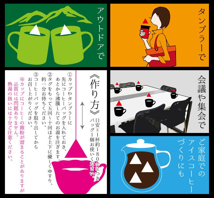 ドリップパックよりも早く抽出が完了し、携帯に便利ですので、タンブラーやカップでのご利用はもちろん、アウトドア用のコーヒーとしてももおすすめです。